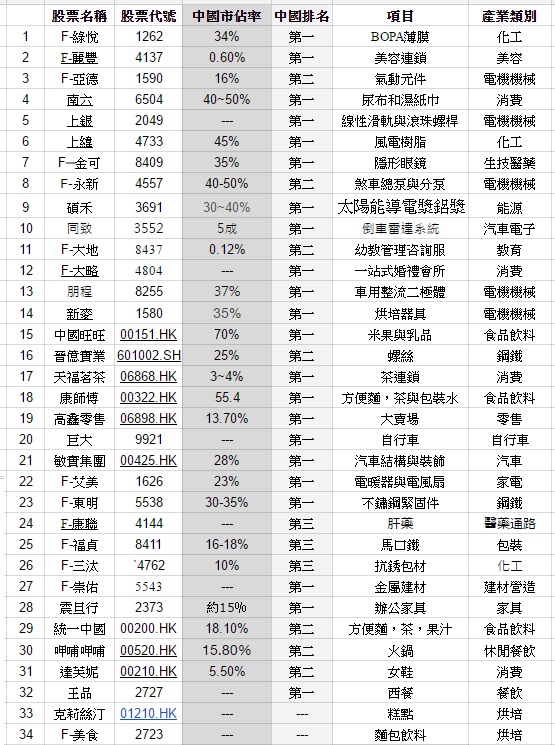 這些年,愈來愈多中概股在台灣上市,我就來幫大家整理那些台灣企業,在中國"市佔率"領先的公司,這些股票普遍分佈在台股,港股的公司。